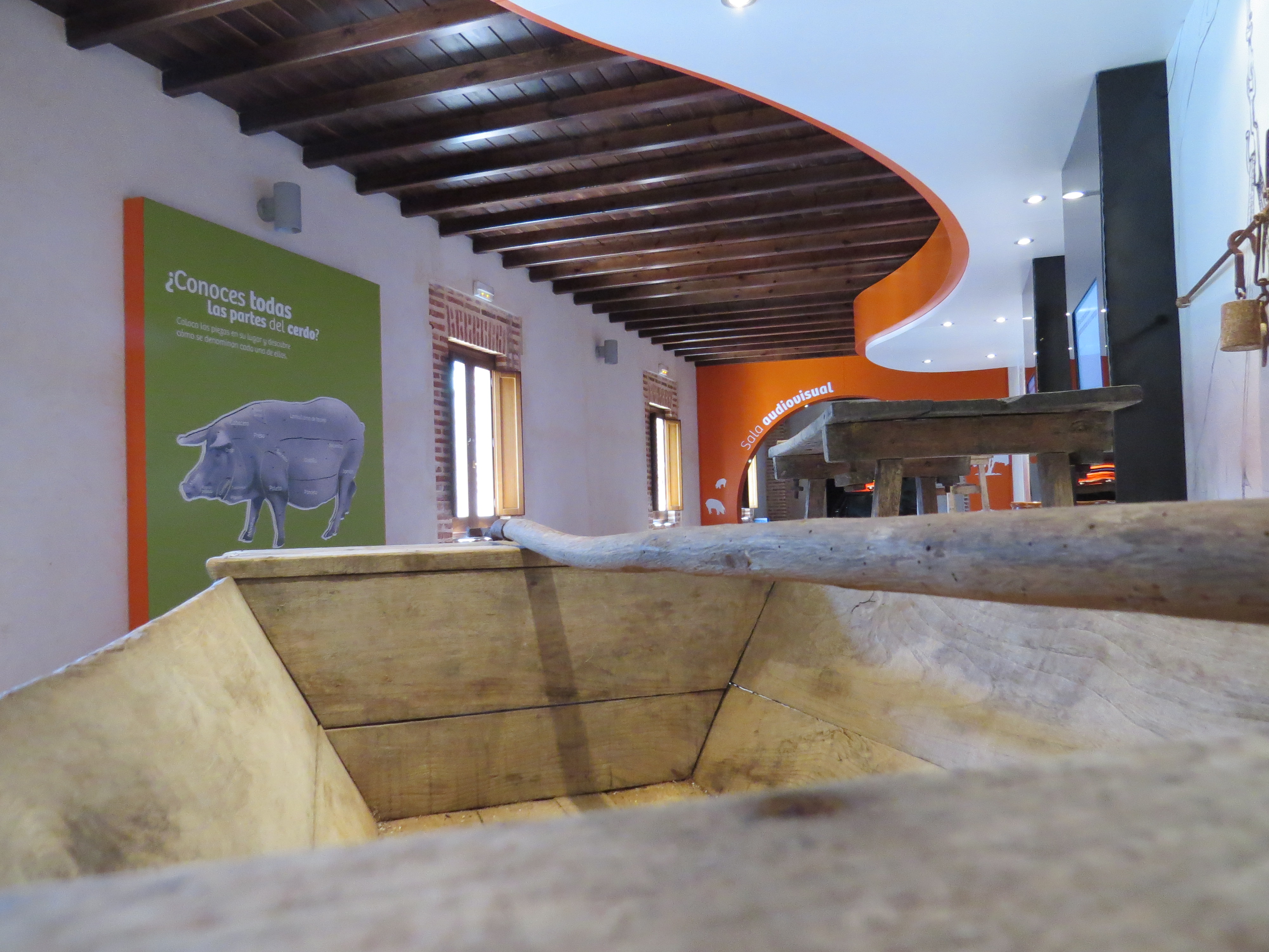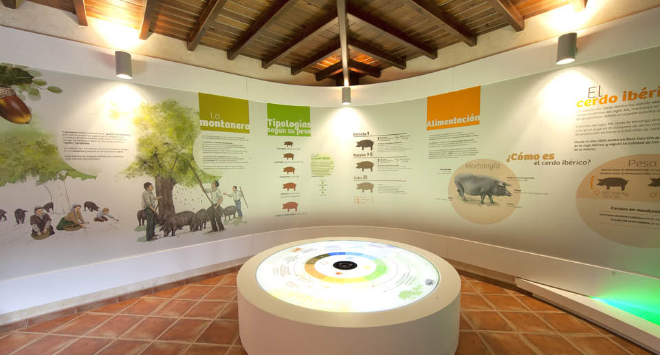 The Iberian Pig Interpretation Centre is located on the upper floor of the Jesuit Cloister Cultural Centre. Inside, through different interpretative resources and under an avant-garde image, the visitor will discover essential aspects of our history and our ethnography; he will know the keys to the prestige and quality of our acorn-fed Iberian hams and sausages.
