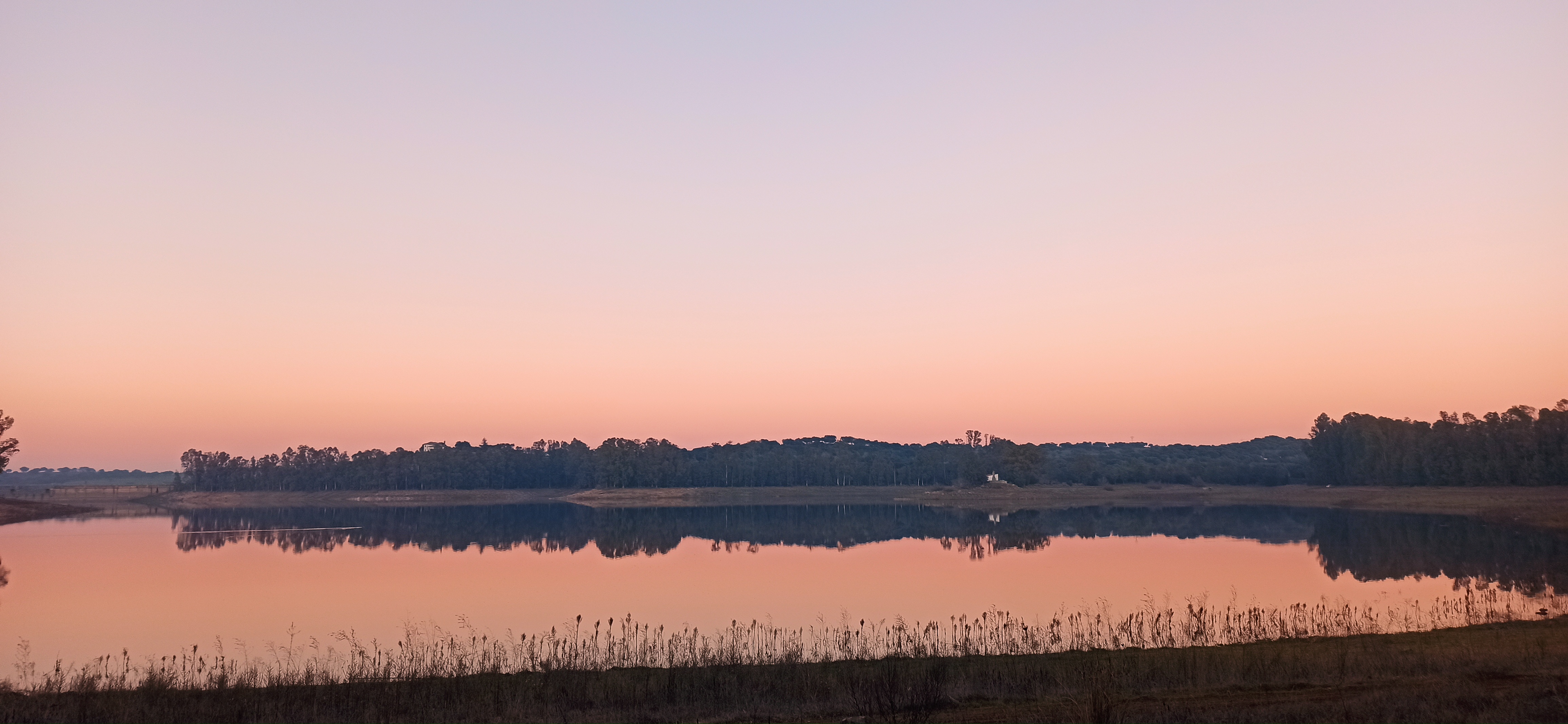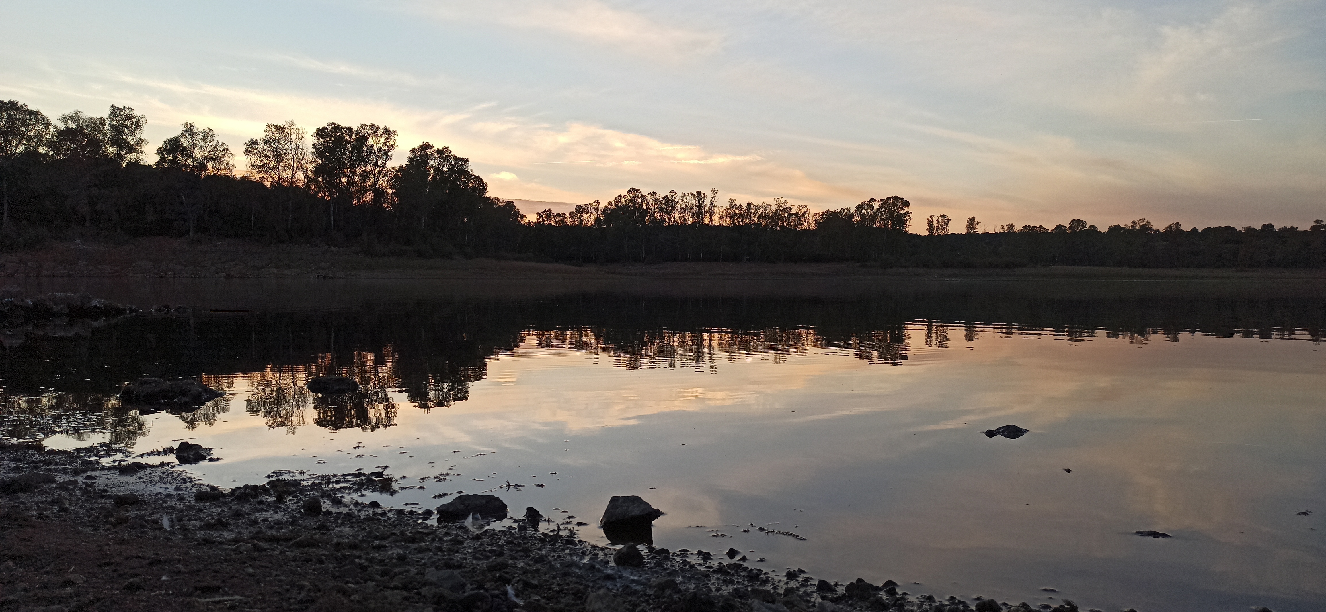 Recibe el nombre de Piedra Aguda en honor de una gran piedra hallada en el valle de la Rivera de Olivenza, de la que recibe sus aguas. La presa, construida en 1956, tiene una altura de 30 metros, 213 metros de longitud y cuenta con un volumen de 16,3 hectómetros cúbicos. Está poblado de eucaliptos en la mayor parte de sus orillas y tiene buenos accesos a los pesquiles. En los alrededores se encuentran también encinas y alcornoques.