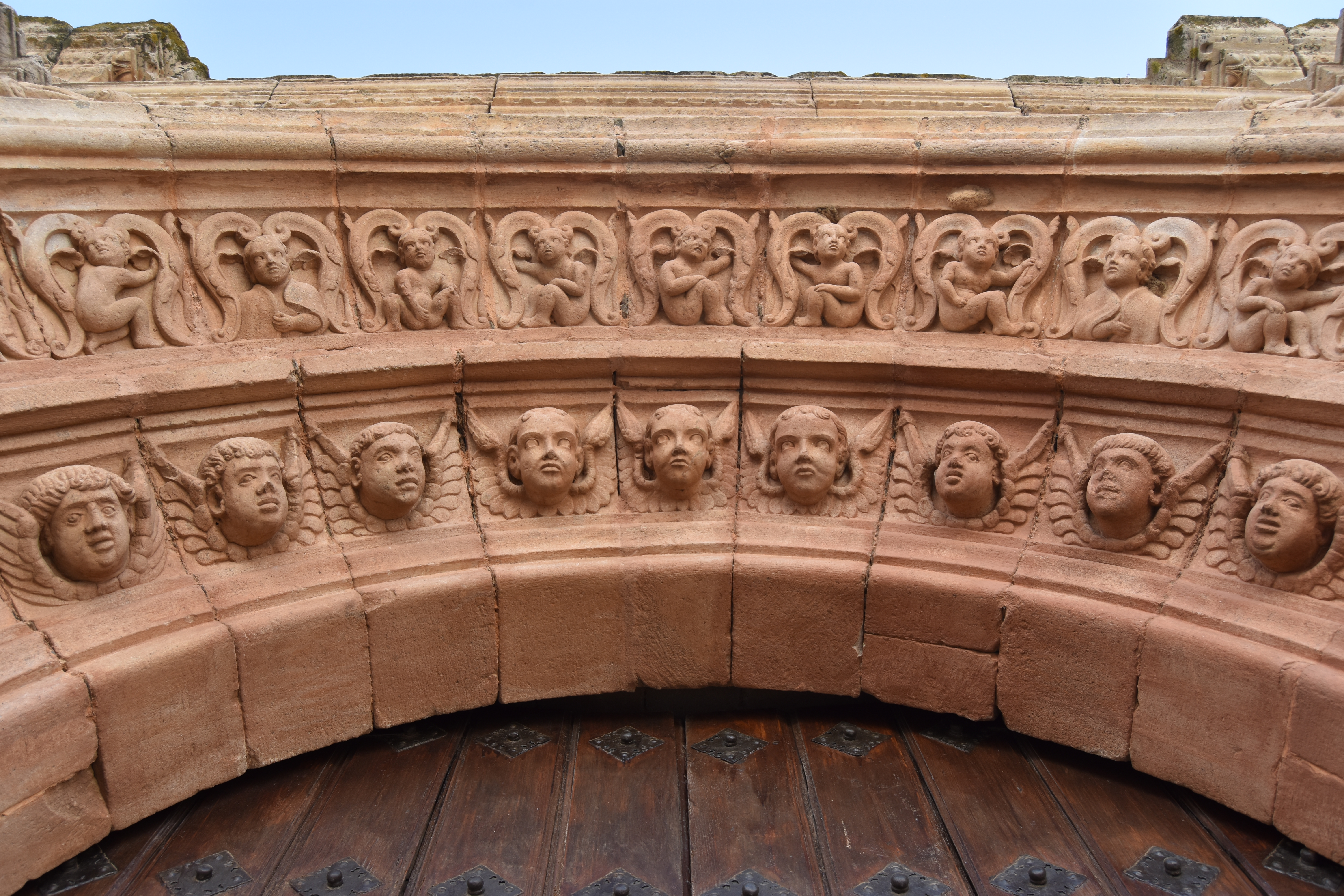 - Pilastra derecha: tres rostros, putti, águila, cabeza de angelito, león rampante y bucráneo.