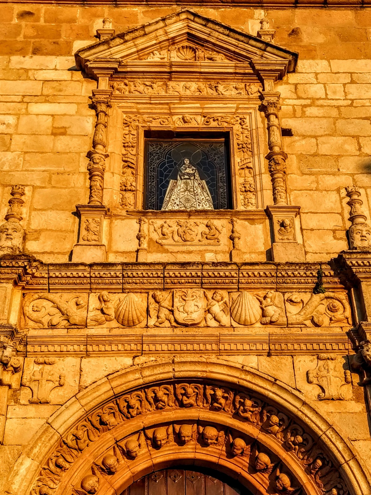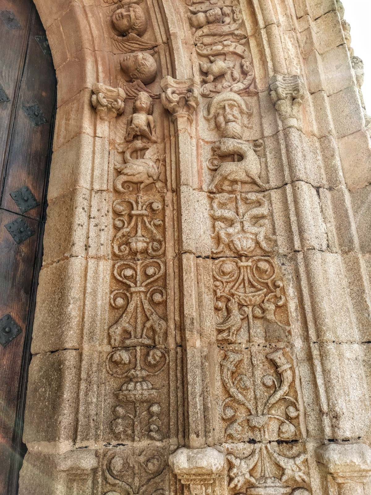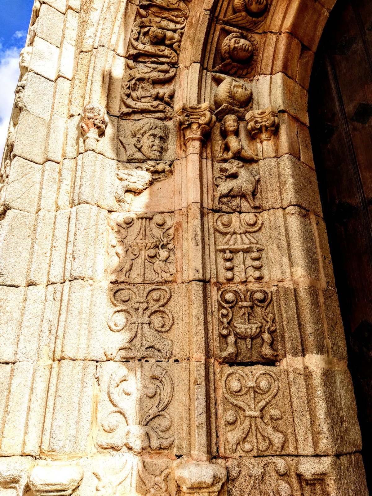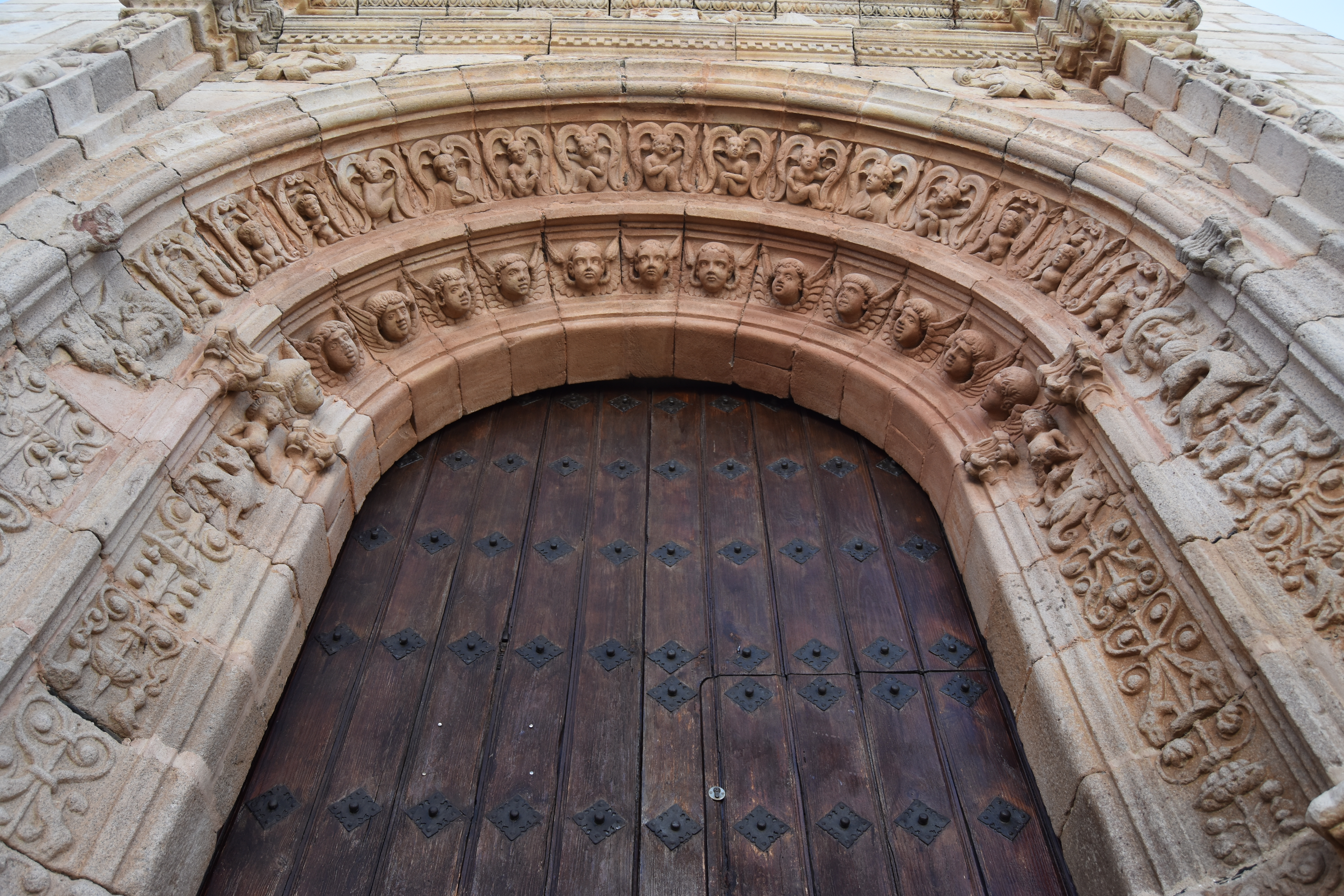 - Si nos adentramos en la magnífica entrada abocinad, vemos que presenta arco de medio punto y una serie de elementos que la convierte en un éxtasis del plateresco extremeño: