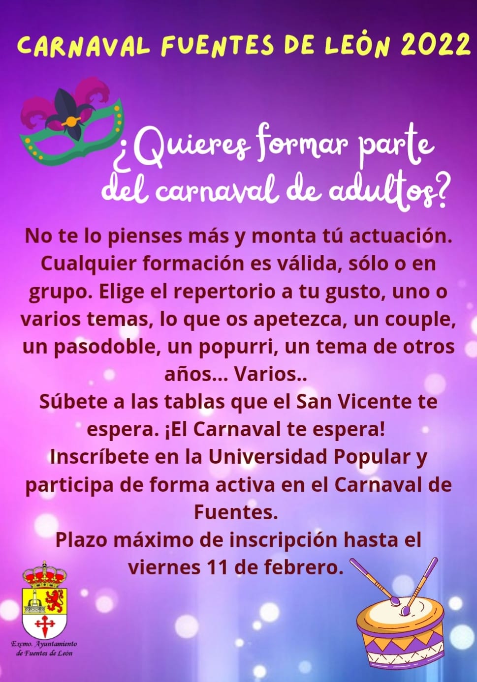 Inscríbete en la Universidad Popular y participa de forma activa en el Carnaval de Fuentes. Plazo máximo de inscripción hasta el viernes 11 de febrero de 2022.