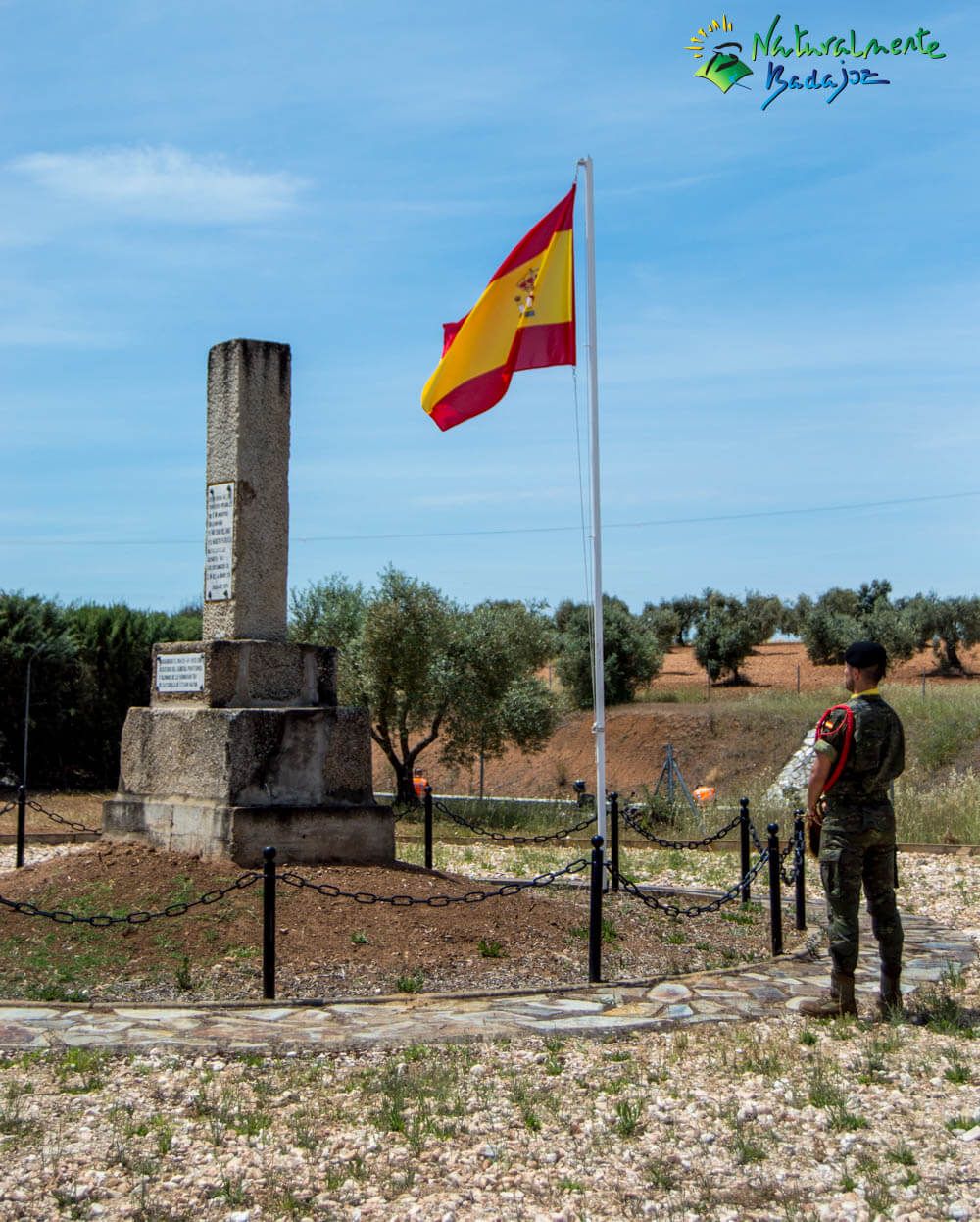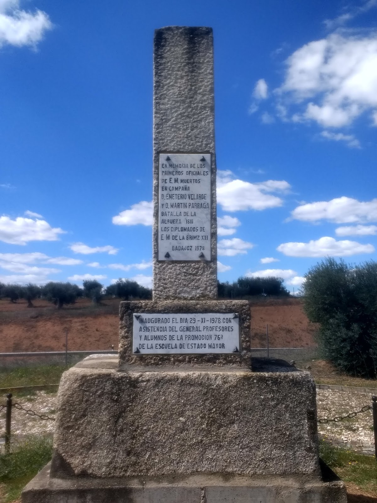 Alli se alza este pequeño cipo con el que el ejercito español rindió tributo de admiración  a los  que combatierpn en el campo de batalla y a los primeros muertos del, por entonces, recién creado cuerpo del Estado Mayor; son el santanderino Emeterio Valarde y el gaditano J. Martín Párraga. Fue levantado en 1.978 por la Brigada Mecanizada XXI de Badajoz.
