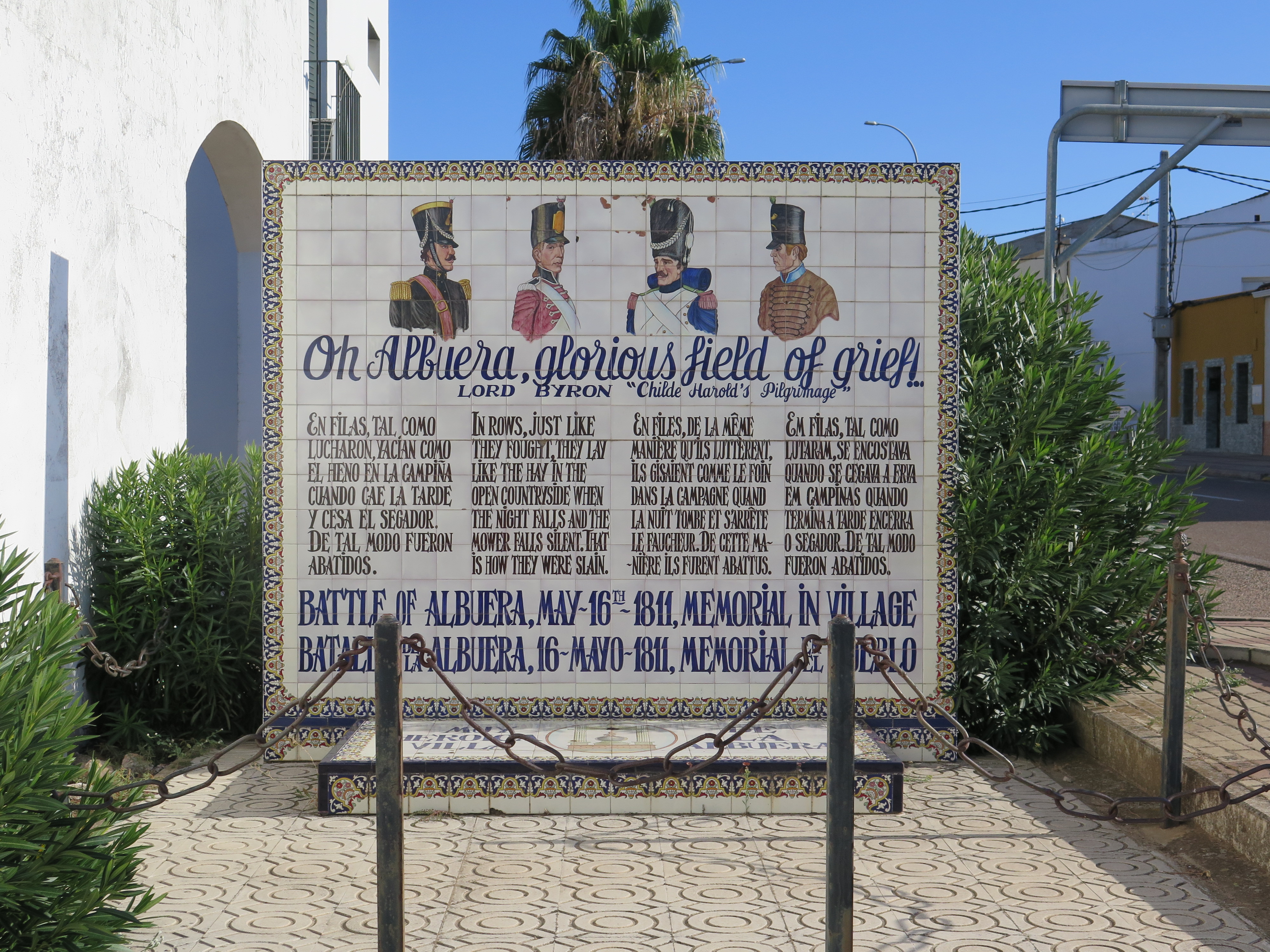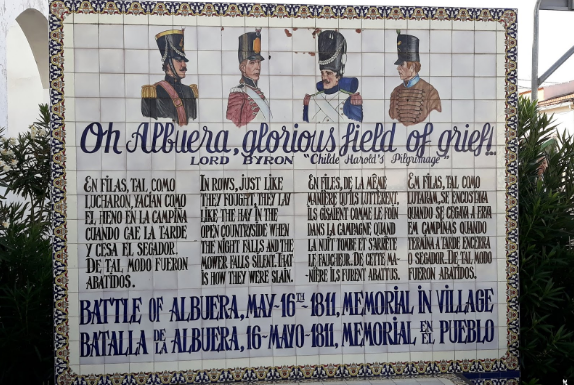 Se puede observar cuatro soldados pertenecientes a los diferentes ejércitos que lucharon en la contienda, ataviados con los uniformes típicos de la época: español, portugues, inglés y francés. Además aparece un poema que Lord Byron dedicó al campo de batalla de La Albuera.