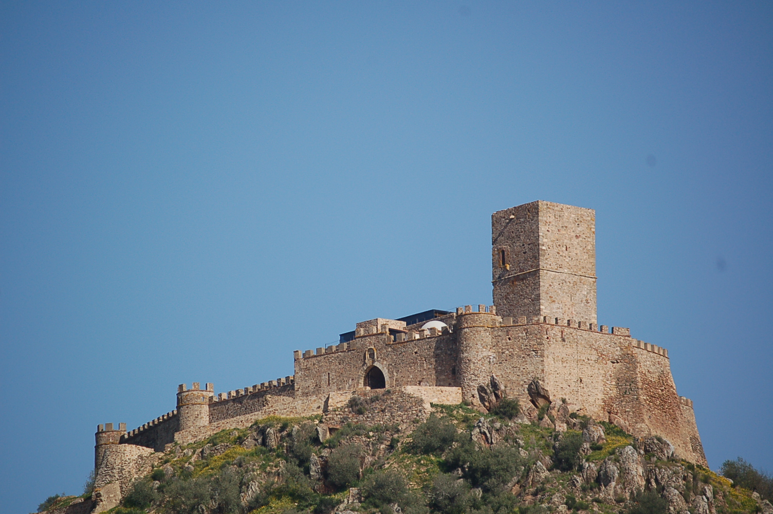 Es el elemento más distintivo de la localidad. Enclavado sobre la cima del cerro de este mismo nombre, domina con su imponente presencia todos los territorios del entorno. De origen árabe, y reconstruido en el siglo XII por el monarca lusitano Alfonso Enríquez, fue consolidado luego por los templarios, convirtiéndose en uno de los bastiones más importantes de esta Orden. Originariamente se componía de triple recinto, reforzado el intermedio con cubos apuntados hacia el sur. Lo preside una poderosa torre de Homenaje, completando el conjunto un buen patio de armas, aljibes, mazmorras, capilla y otras dependencias de las que se conservan distintos restos. Hoy se encuentra en su interior el Centro de Interpretación de las Fortificaciones del Gran Lago de Alqueva y se prepara para albergar en él un espacio único para convenciones, congresos y exposiciones con posibilidad de hospedaje.