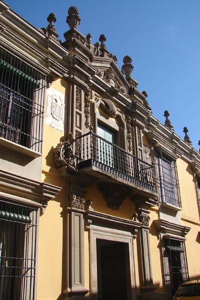 La fachada se caracteriza por ser una fachada muy simétrica, tiene dos plantas bien diferenciadas por medio de una imposta; en la primera planta destaca la portada de mármol adintelada con molduras decorativas.