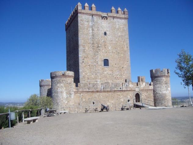Este castillo fue edificado por Gómez Suárez de Figueroa cuando el pueblo era ya un núcleo floreciente. Edificado con fuertes muros de piedra de más de dos metros de espesor, resulta, según se ha dicho acertadamente, por la regularidad de su traza, buena construcción y armonía arquitectónica, una de las realizaciones militares más destacadas de la región.