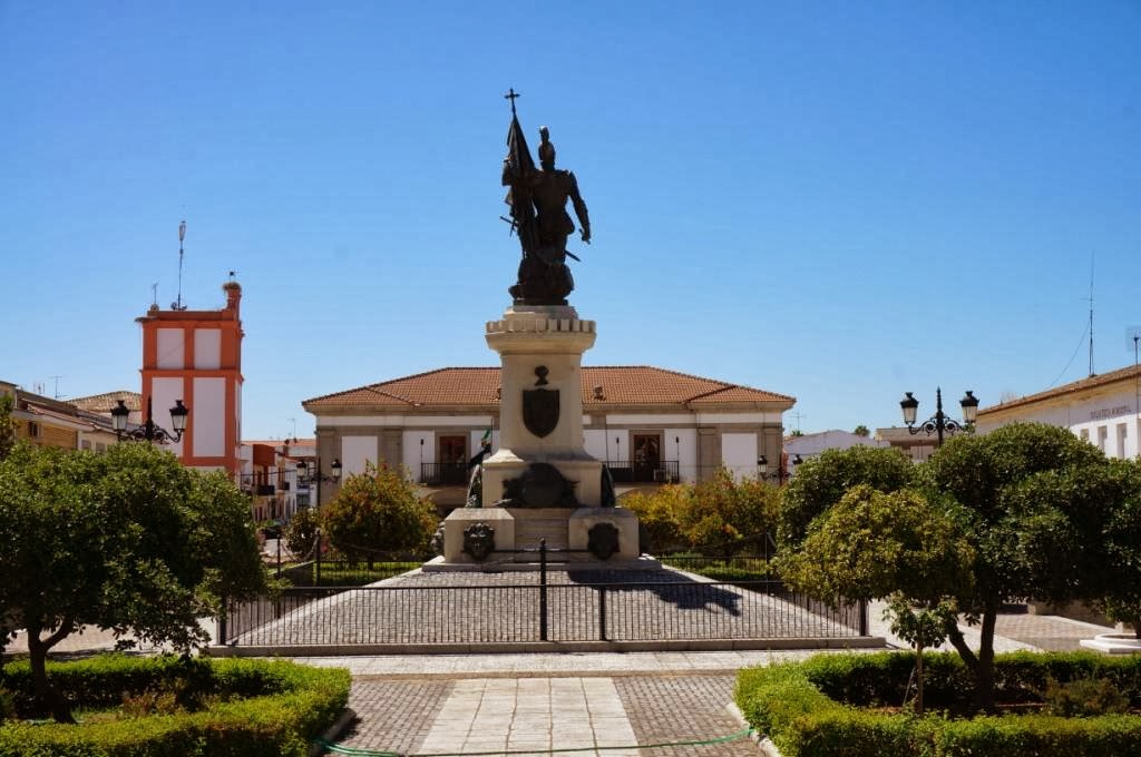 En el centro de la plaza se yergue el monumento a Hernán Cortés, obra en bronce de Eduardo Barrón, erigido en 1890. Representa al Conquistador en actitud arrogante, sujetando un estandarte y con diversas figuraciones simbólicas a los pies. No lejos se sitúa otro grupo escultórico dedicado a los Caídos. Realizado también en bronce por el villanovense García Lozano en 1985, representa una figura femenina con un moribundo en brazos.