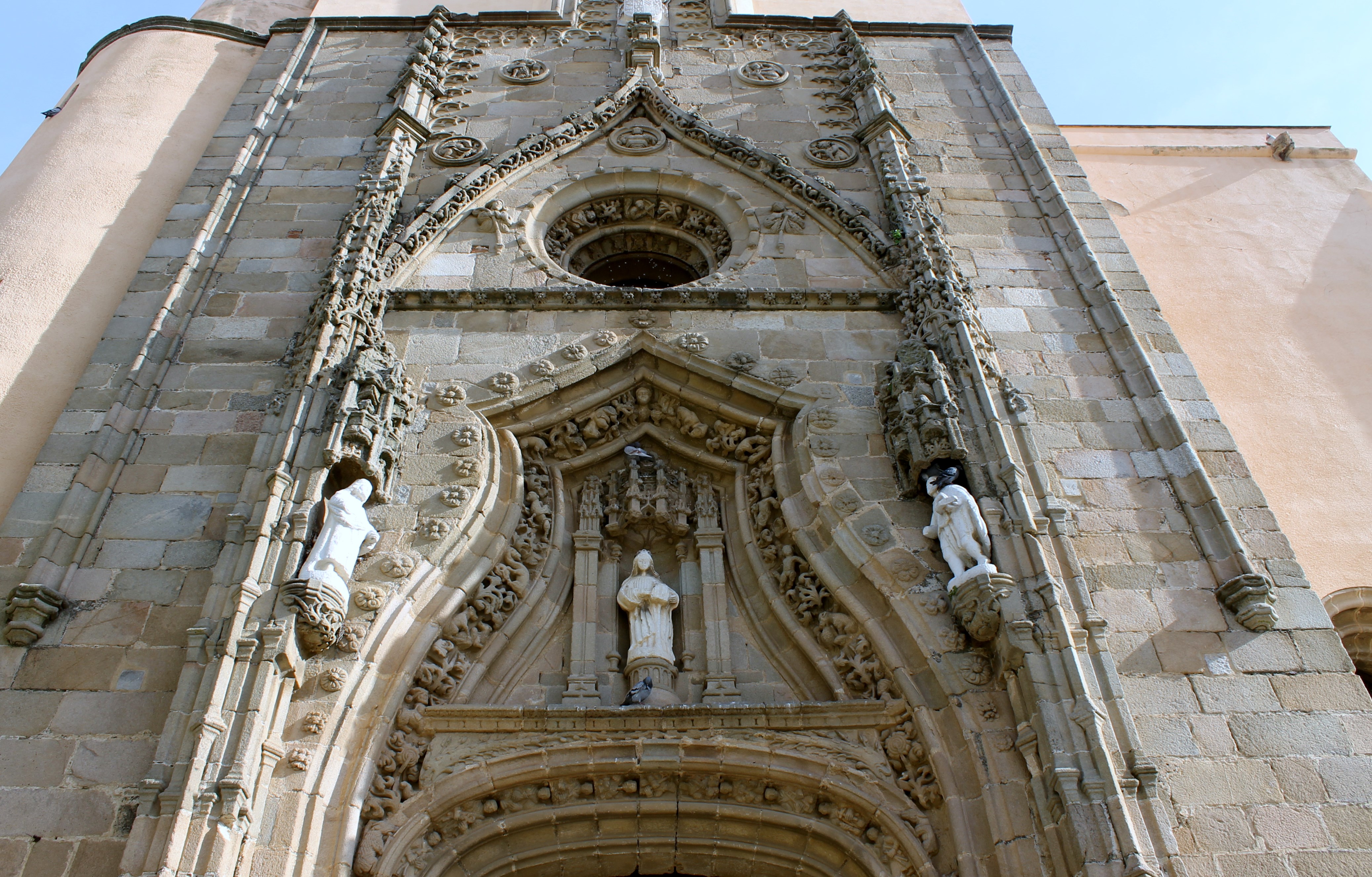 Un arco mixtilíneo, también perteneciente al primer cuerpo y en el cual se repite la misma decoración de motivos florales y animales fantásticos que en la parte inferior. En la parte exterior del arco aparecen floretas. El arco está presidido por la imagen de la Virgen de estilo gótico, tallada en mármol de Burguillos del Cerro. En los laterales se pueden observar otras dos esculturas de bulto redondo, que pertenecen a San Juan Evangelista y Santiago El Mayor.