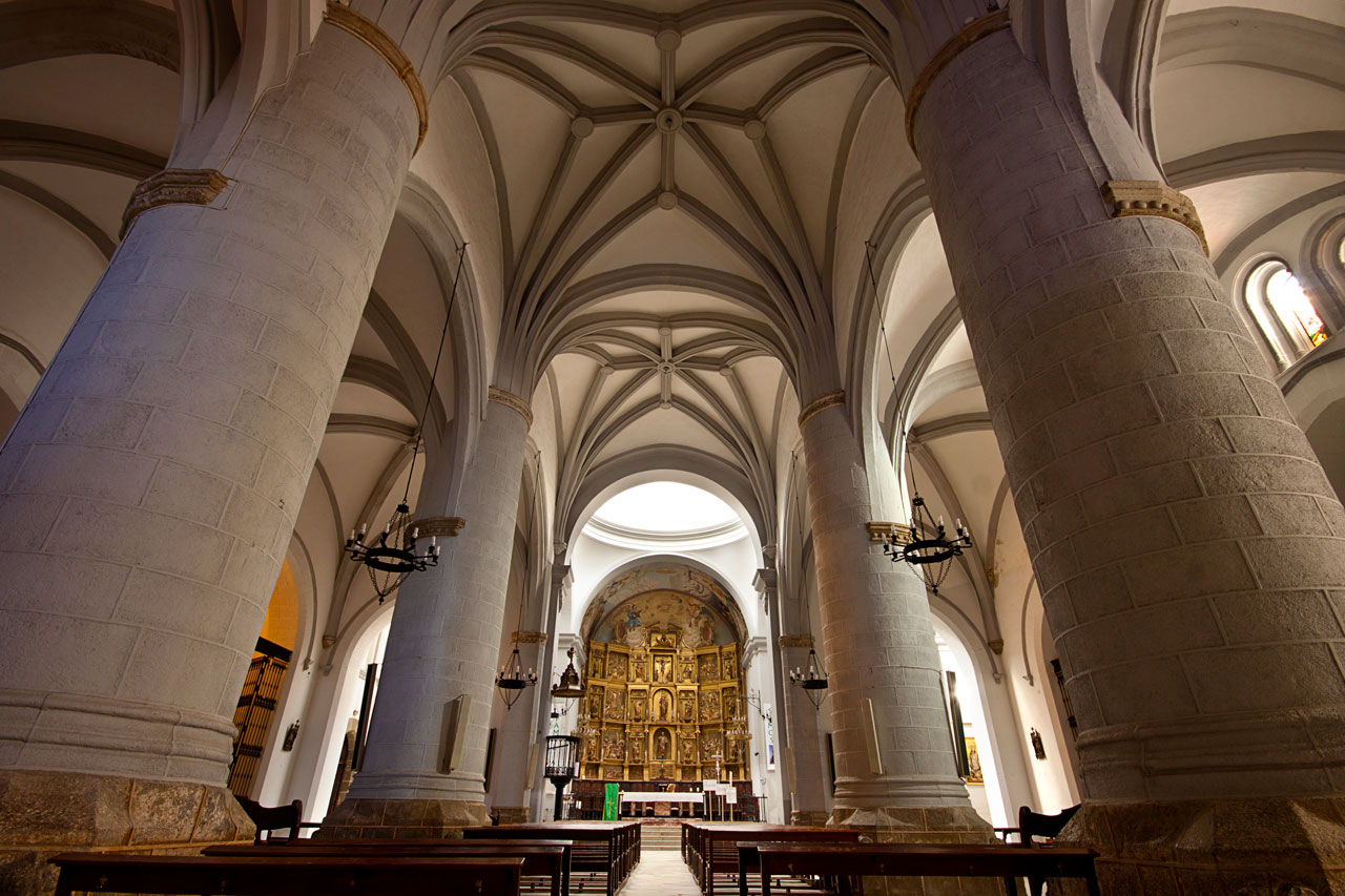 Es una construcción de estilo gótico, de planta rectangular dividida en tres naves sostenidas por gruesas columnas y cubiertas con bóvedas de crucería, destacando la bóveda del sotocoro de estilo gótico flamígero.