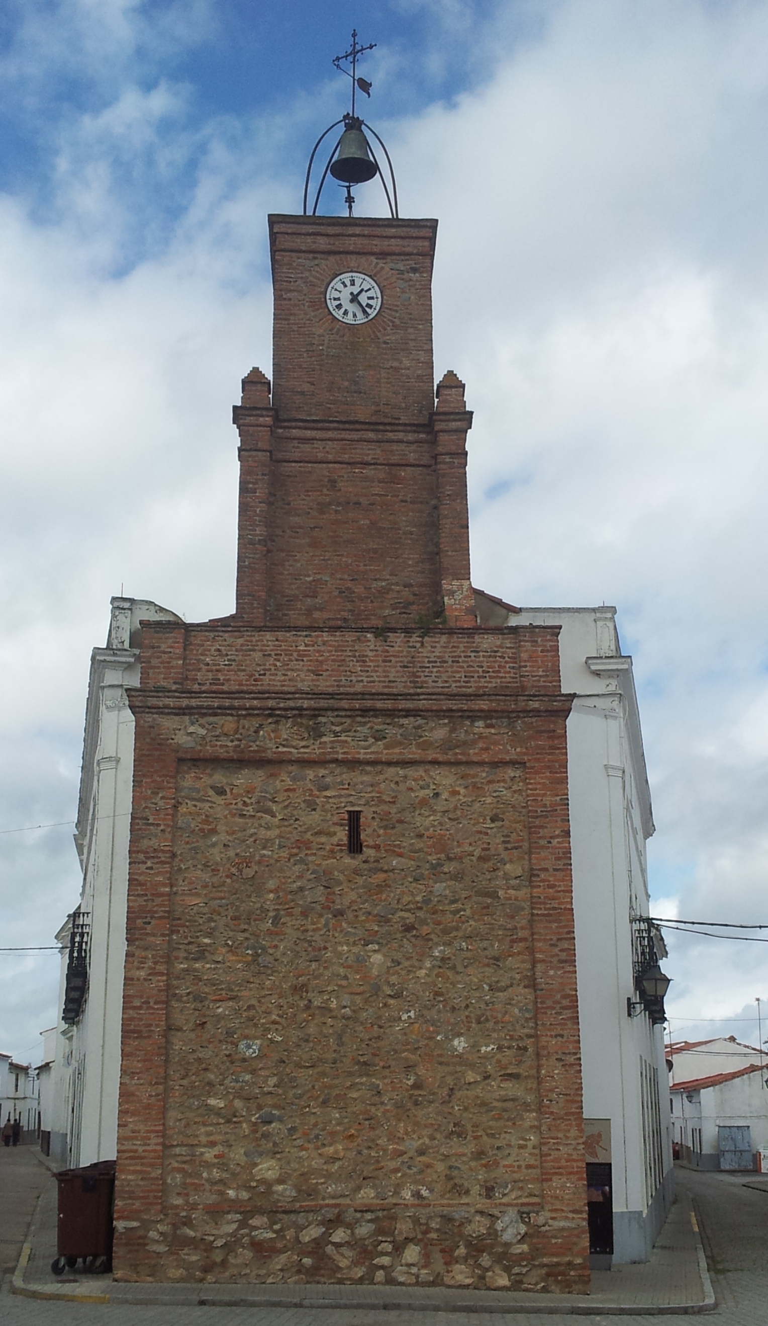 Edificio cuadrangular que se encuentra situado en la Plaza de España. Este edificio fue construido expresamente para la instalación de un reloj. Construido con piedras y las esquinas que forman el cuadrado es de ladrillo vistos. Consta de dos cuerpos el primero de una altura aproximada de... metros. El segundo cuerpo es el que contiene el reloj con tres arcos y en la cúspide del mismo está instalada la campana que es la que con su tin tan va indicando las horas. En la misma plaza se localiza la antigua posada, originando un rincón de gran pintorequismo; y enfrente de la torre, el en otro tiempo popularísimo local -barbería, relojería, cuchillería, y sobre todo, lugar de reunión- de un peculiar personaje, muy querido en el pueblo, llamado por todos El Maestro.