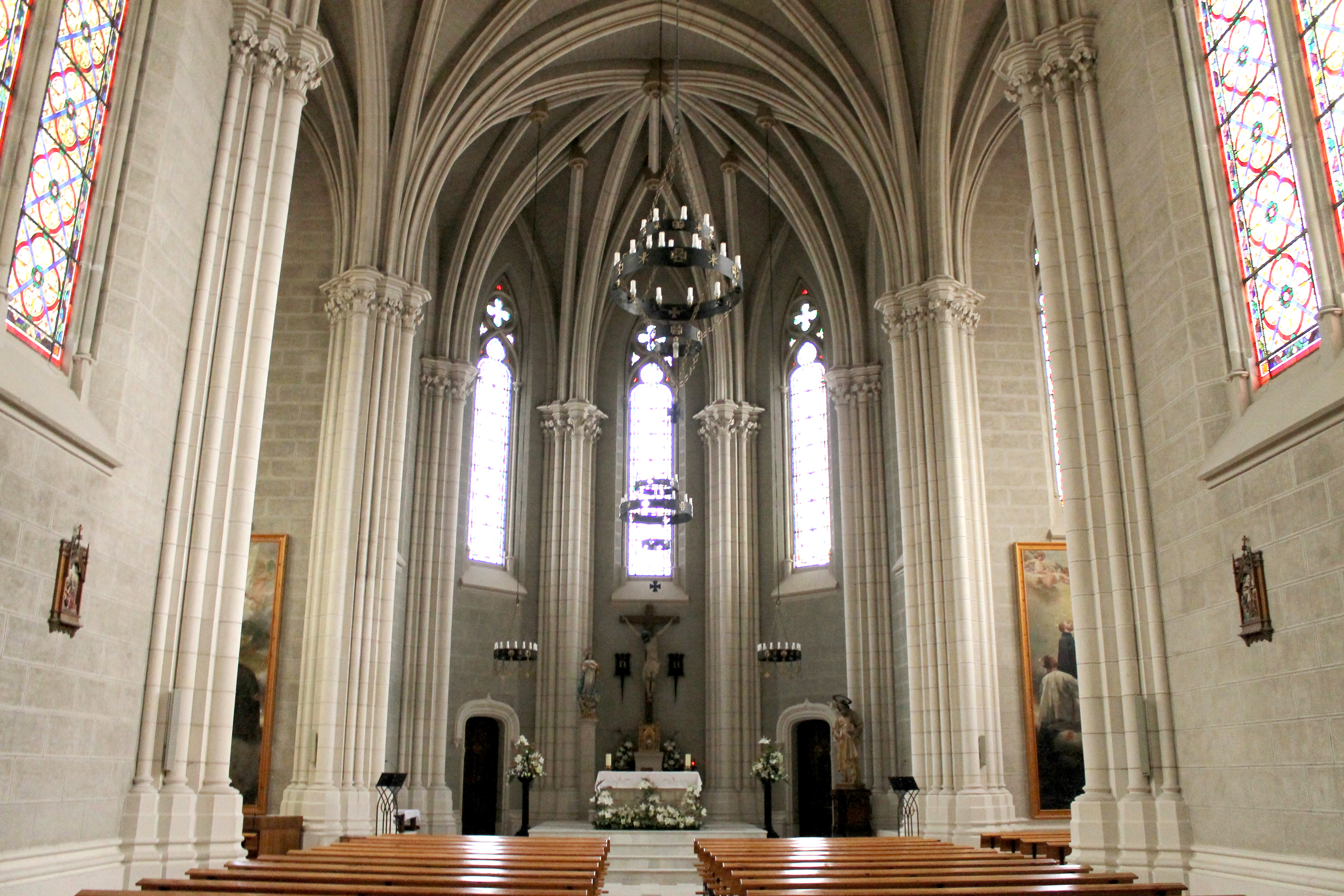 El colegio consta de una galería que arranca en el vestíbulo y acaba en la Capilla neo-gótica. La Capilla se construye entre 1.905 y 1.908, siguiendo el proyecto del arquitecto Enrique Fort. La planta es de cruz latina, nave central, crucero y coro. En el exterior llaman la atención: los pináculos, los altos contrafuertes y las elevadas y bellísimas vidrieras ojivales.