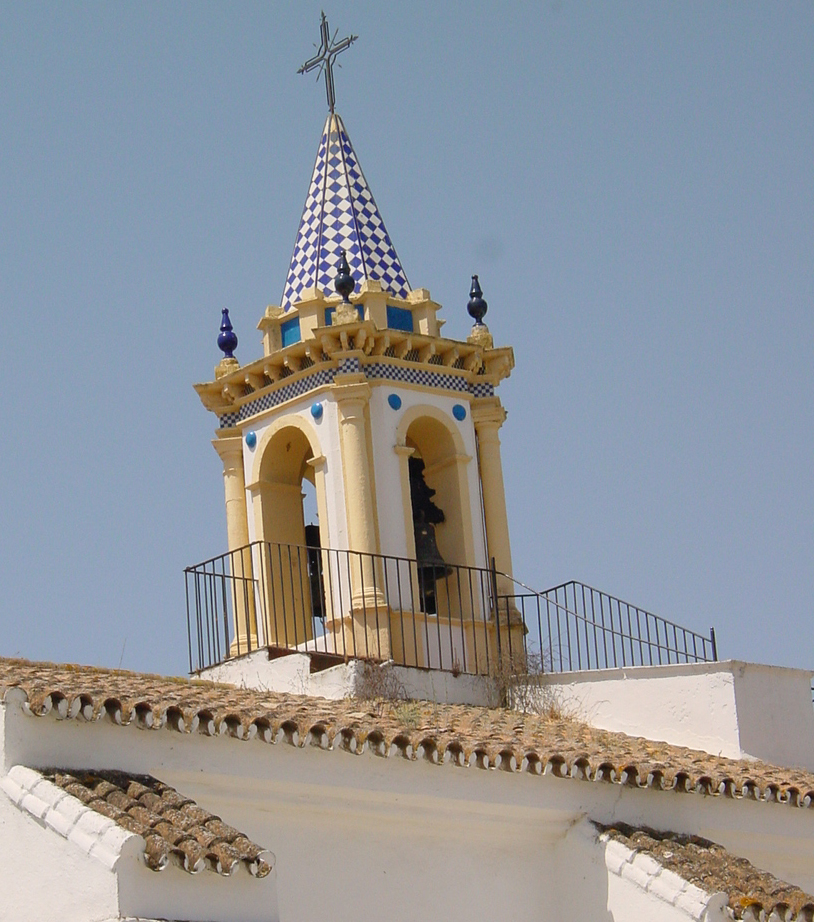 En el exterior del edificio, corona la fachada un cuerpo de campanas con un vano de medio punto en cada lado, sobre el que aparece un chapitel poligonal de mampostería cubierto por azulejos.