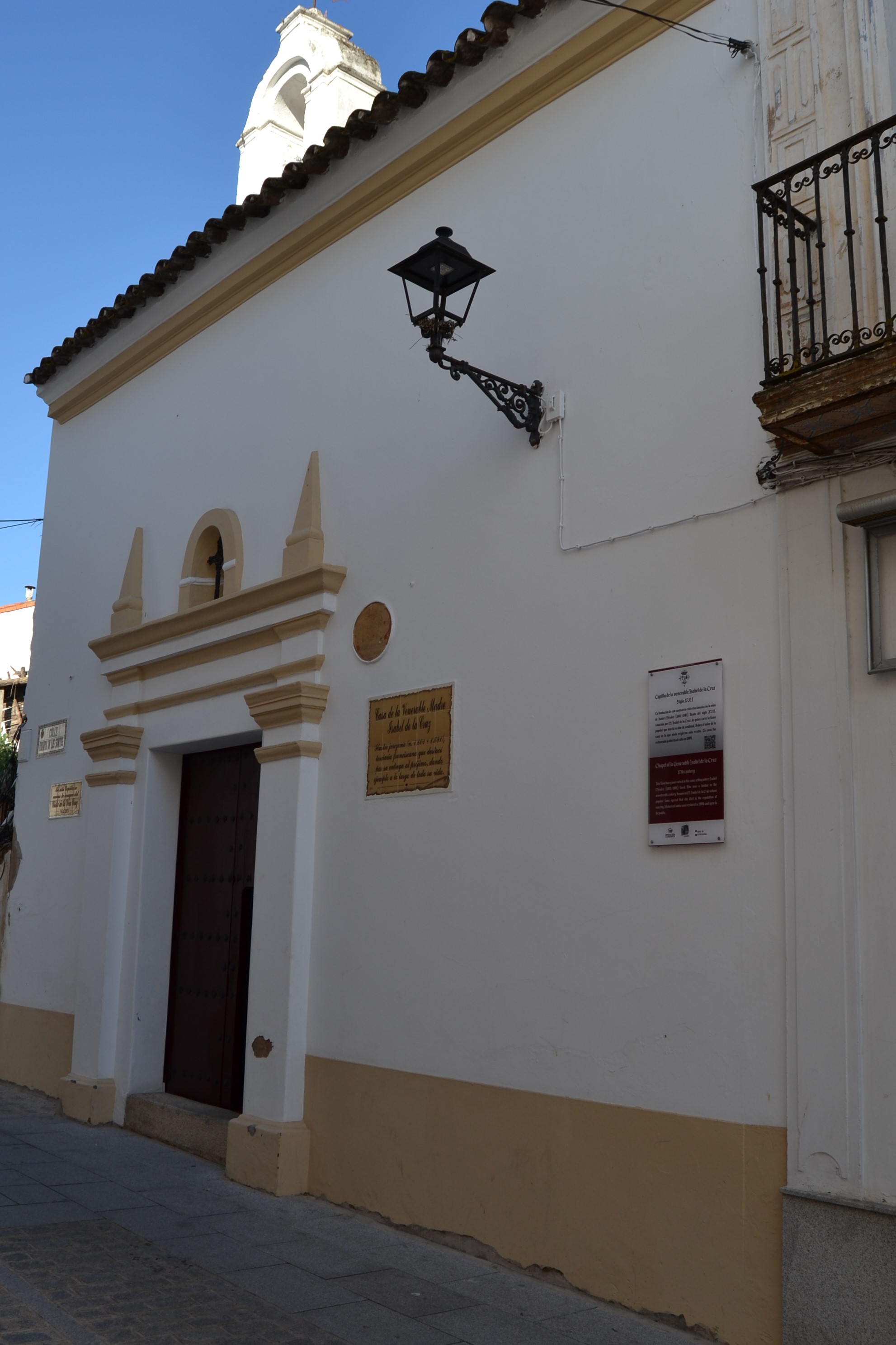Está situada en la Fuente de los Santos frente al Palacio de la Vicaría, edificio en el que se encuentra ubicado el Museo de Arte Sacro de la Ciudad. La fundación de este santuario está relacionada con la vida de Isabel Méndez, beata del siglo XVII, conocida por M. Isabel de la Cruz, de quien corre la fama popular que murió en olor de santidad, y por eso sobre el solar de la casa en que habitaba erigieron esta ermita. En la portada de ella hay un rótulo en barro cocido, que reza Sacellum venerabilis Elisabeth á Cruce, quae obiit X Kalendas Martias anno millesimo sexcent octogessimo primo. Esto es: Capilla de la venerable Isabel de la Cruz, que murió el 10 de las Kalendas de Marzo de 1681. En ella se venera el Cristo de la Vera Cruz.