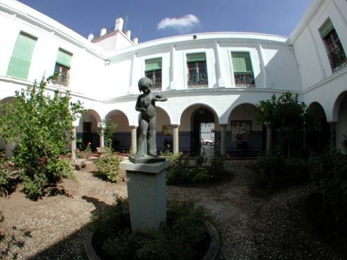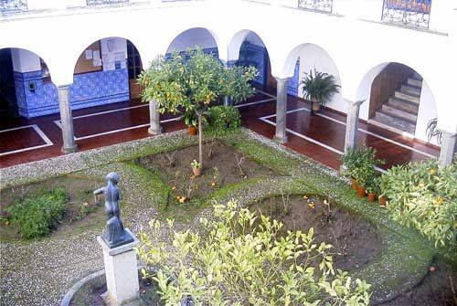 La puerta principal da acceso a un patio central porticado, rodeado de corredores y dos pisos, con magníficas labores de rejería y azulejos de estilo portugués, destacando en el centro del mismo la escultura en bronce de la Niña de la Paloma, obra del escultor santeño Mauricio Tinoco.