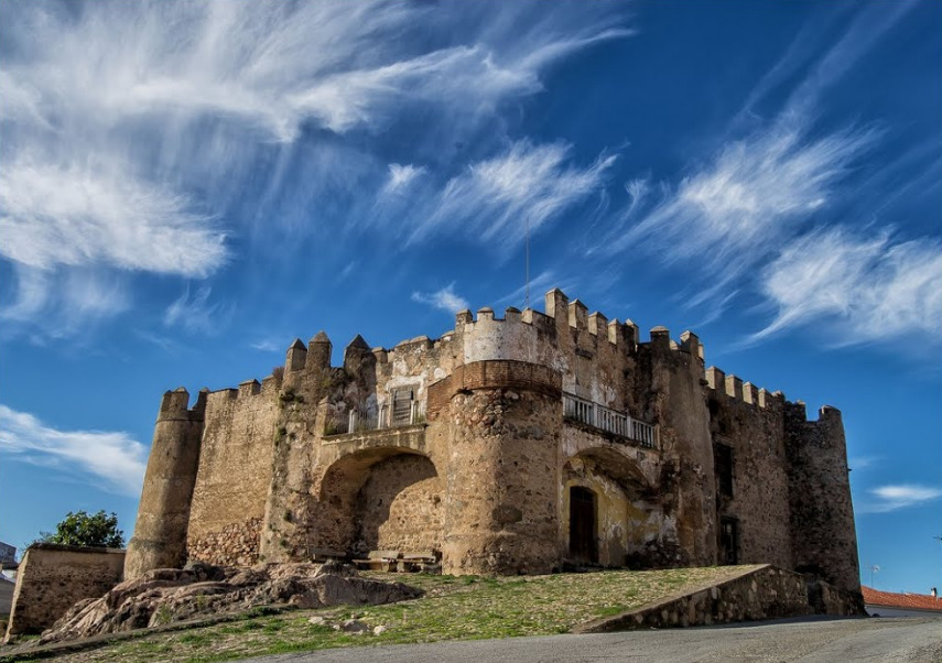 Construido en el siglo XV por el comendador Rodrigo de Cárdenas sobre una edificación anterior de la Orden del Temple, este castillo no puede ser considerado una construcción puramente defensiva ni tampoco militar, tratándose, más bien, de un edificio de tipo palaciego. Esta sólida edificación de planta hexagonal está realizada en mampostería y piedra con seis torres distribuidas de forma irregular a lo largo de su perímetro. Desde el exterior destaca especialmente la robustez de la torre del homenaje, de planta cuadrangular, además de sus torres esquineras y sus esbeltos muros almenados. En su interior alberga dos amplios patios, una capilla y amplias estancias distribuidas entre sus dos plantas. Sobre el balcón, por encima de la puerta principal, se puede observar el escudo de Felipe II, monarca en cuyo reinado se terminó la construcción del palacio a finales del siglo XVI.