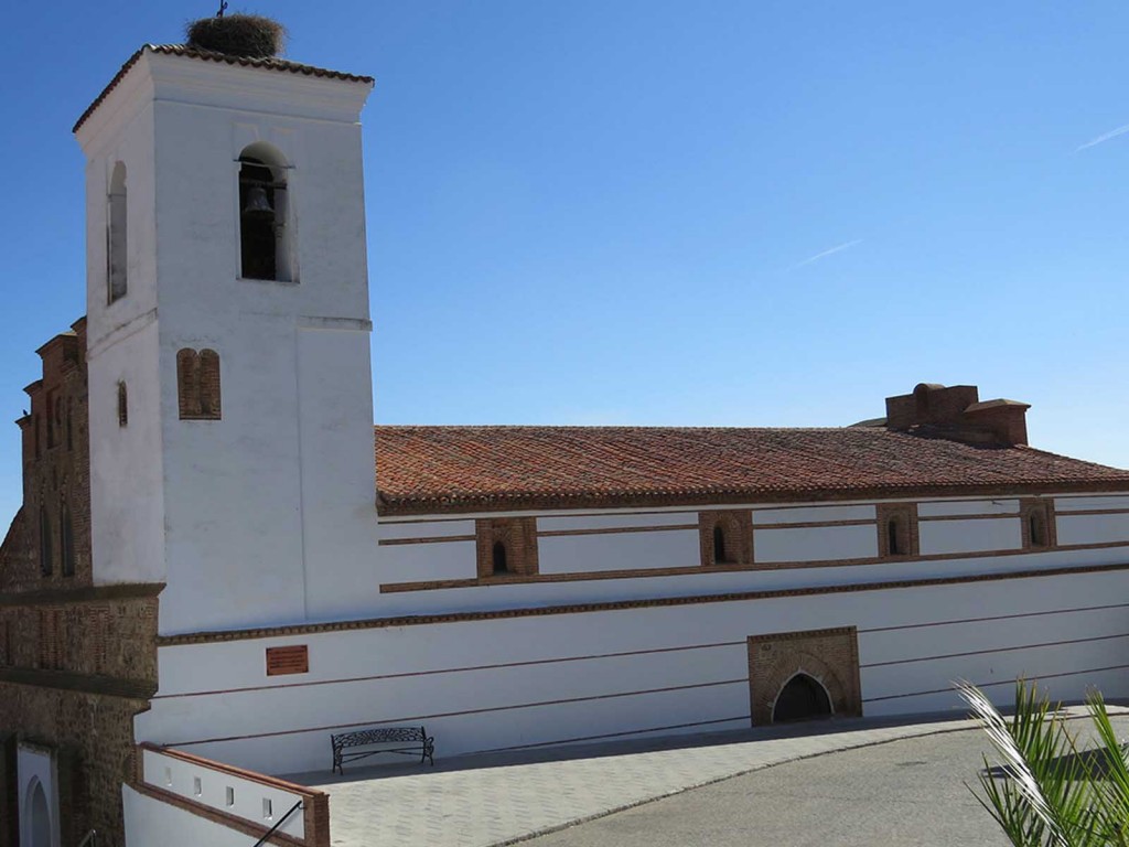 estilo Románico-Mudéjar, de los siglos XI al XII, hecha de mampostería con doble hiladas de ladrillo habiendo sido en sus principios una Mezquita Árabe. La fachada principal a los pies del templo está decorada en estilo mudéjar con numerosos vanos de arcos apuntados y polilobulados. En su costado norte, tiene una portada de piedra labrada de estilo plateresco que fue mandada a construir por Fray Juan de la Puebla, apreciándose en la misma, esculpido en piedra, el lema de los Sotomayor TODO ES POCO.