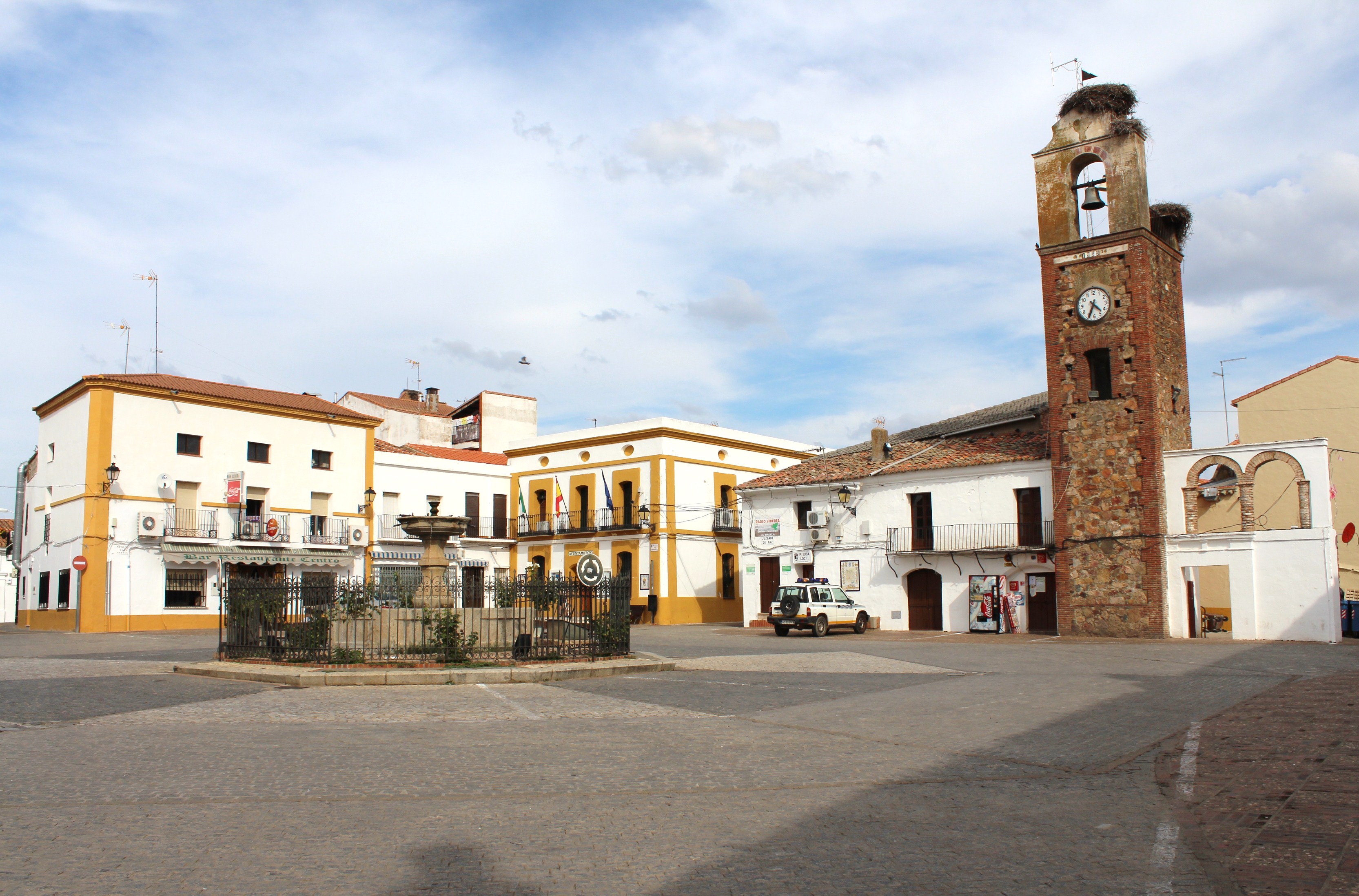 La Torre del Reloj se alza majestuosa junto a dos arcos de medio punto, siendo este conjunto parte del anterior escudo municipal. De forma cuadrada, fue construida de mampostería y ladrillo en el año 1953 y en su parte superior cuenta con un campanario. El agua, elemento fundamental para la vida, ocupa un espacio privilegiado de acuerdo a su valor: el centro de la plaza. Hacia finales del siglo XV, un rudimentario pilón acercaba el agua al pueblo. Más tarde, pasó a ser una fuente de cuatro caños, mandada construir por el Conde de Siruela Don Gabriel de Velasco y de la Cueva en 1604, para suministrar el agua potable. Finalmente, esta fuente fue sustituida por la actual, de forma octogonal y con un caño a cada lado, cuyo material principal es el granito. Mirando hacia el Ayuntamiento se sitúa la estatua erigida en honor de D. José Moreno Nieto.