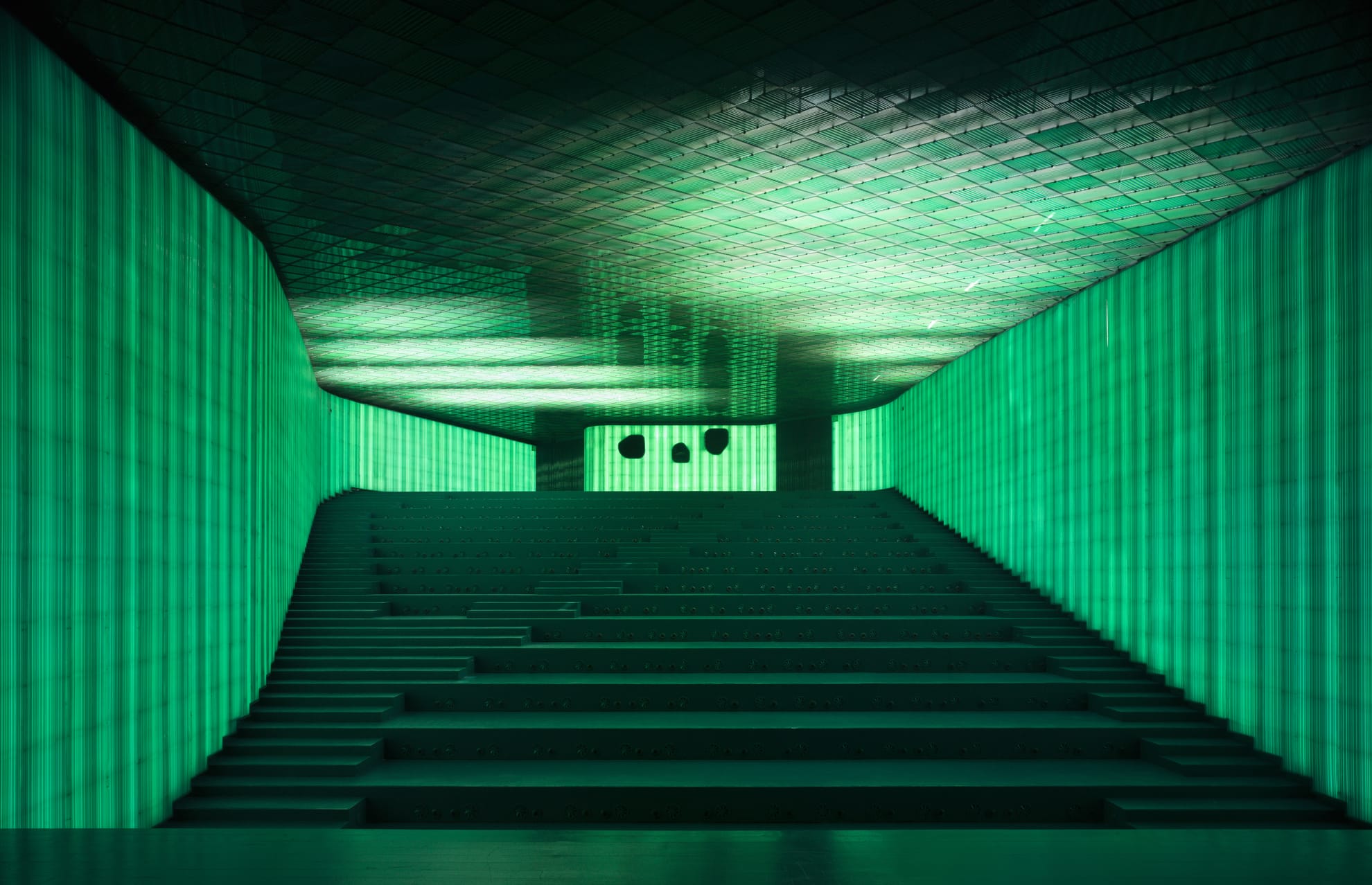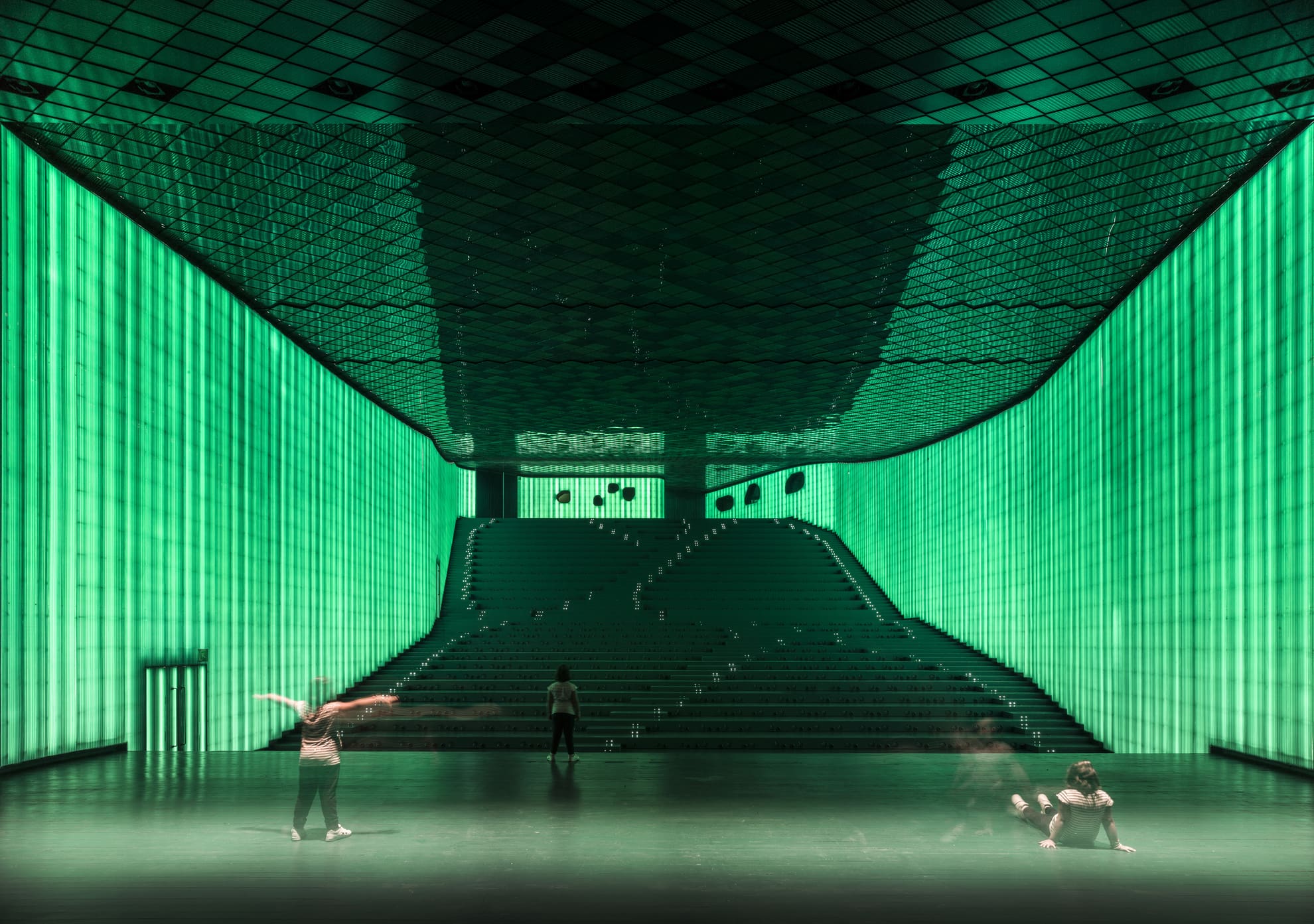El terreno, de firme inclinado, se configura como una plaza pública, una más en la ciudad. Despejada, para acceder a la sala polivalente, auditorios y de enlace exterior con el cubo puede ser también utilizada para actos y actividades al aire libre, cuando la época del año lo permita.
