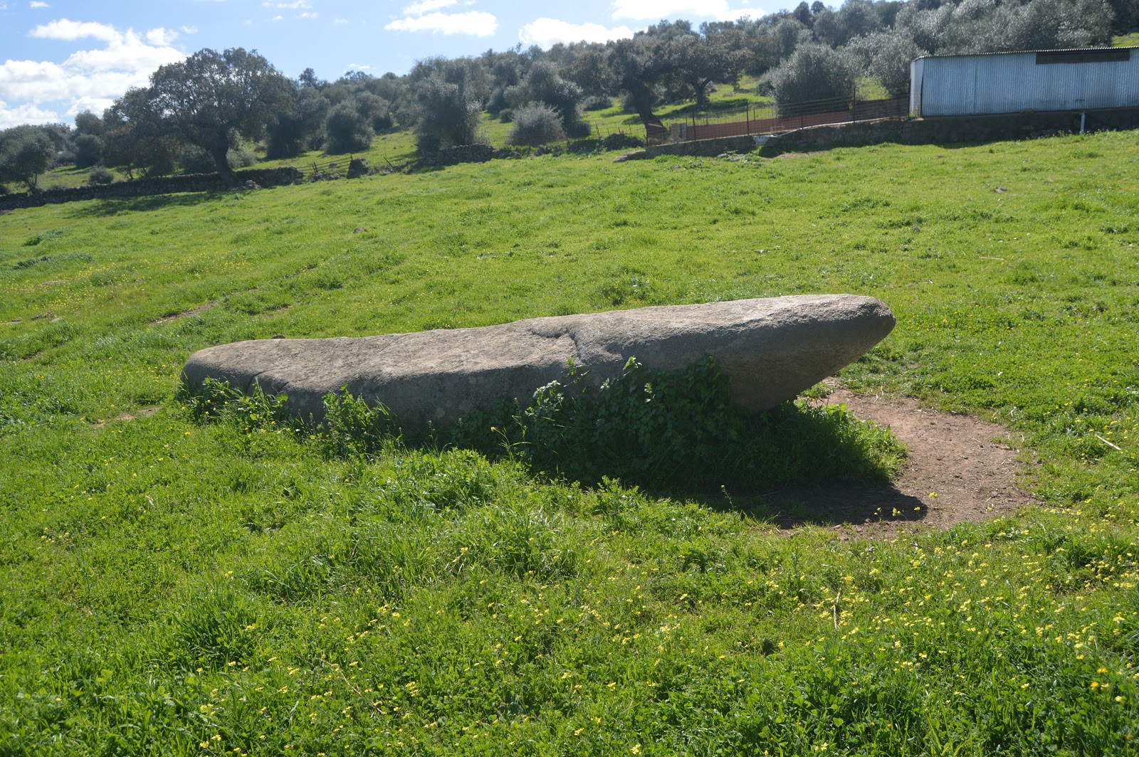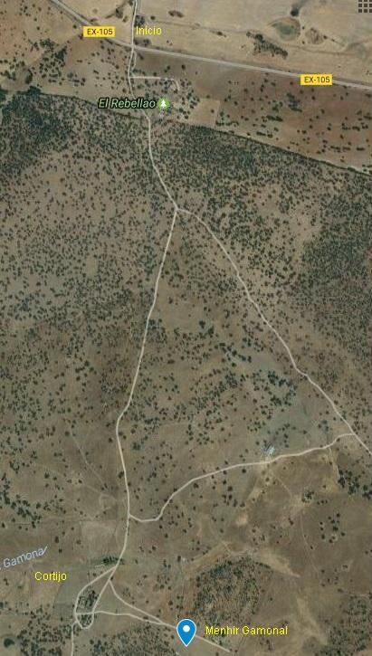 Menhir yacente de más de 4 metros de longitud. Se accede a él desde la carretera que une Almendral con Valverde de Leganés (EX 105), a 7 km aproximadamente de la primera localidad, justo con el cruce de dos caminos, al lado del cortijo del Revellado (también Rebellado).