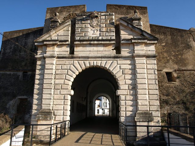 Faz parte da fortificação abaluartada, construida no século XVII para as Guerras de Restauração. Esta muralha posuia três portas, das quas só se conserva a mais monumental, a denominada do Calvário, orientada para Portugal.