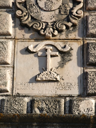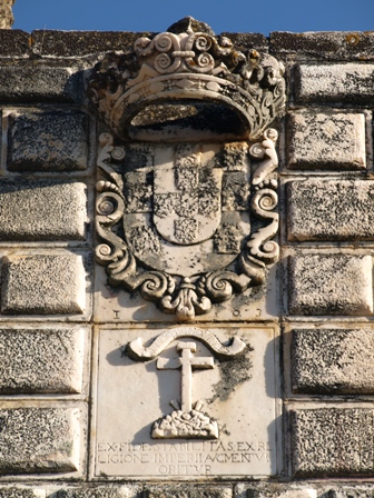 Surpreende a sua fábrica de silhares de mármore almofadado e bujardado. A porta abre com um arco adoelado de volta perfeita, separado por duas pedras de imposta que avançam para a luz da porta. Uma pequena linha de cornija da passagem para a parte superior em frontão triangular partido pelas aberturas do mecanismo da ponte levadiça. No meio do frontão, um motivo rectangular inclui no seu centro, em mármore polido a coroa real sobre as armas de Portugal. Na parte inferior reproduz-se um calvário, para lembrar que a construção desta muralha e porta obligaram a eliminar o calvário que ali se encontrava anteriormente. Por baixo do calvário, uma inscrição latina lembra que: “Da conservação da Fé e da religião surge o aumento do Império”.