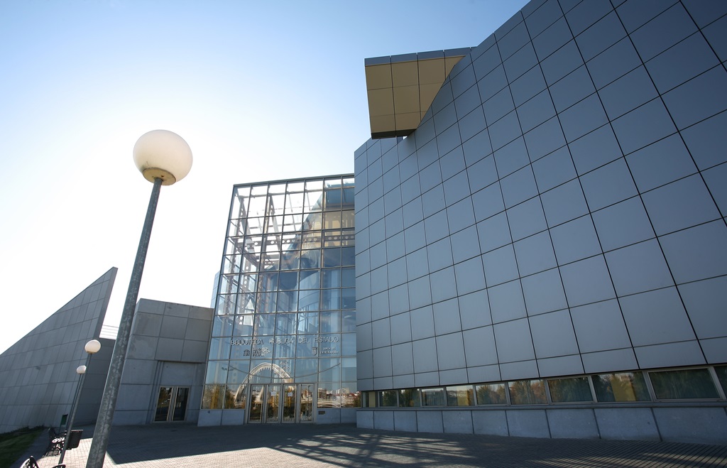 Inaugurada el 5 de mayo de 1999, fue diseñada por el arquitecto Luís Arranz. Realizada en granito, acero y vidrio, se presenta en forma de tres cubos entrelazados a los que se une una gran rampa escalonada. Está situada en la margen izquierda del Guadiana, junto al puente Lusitania