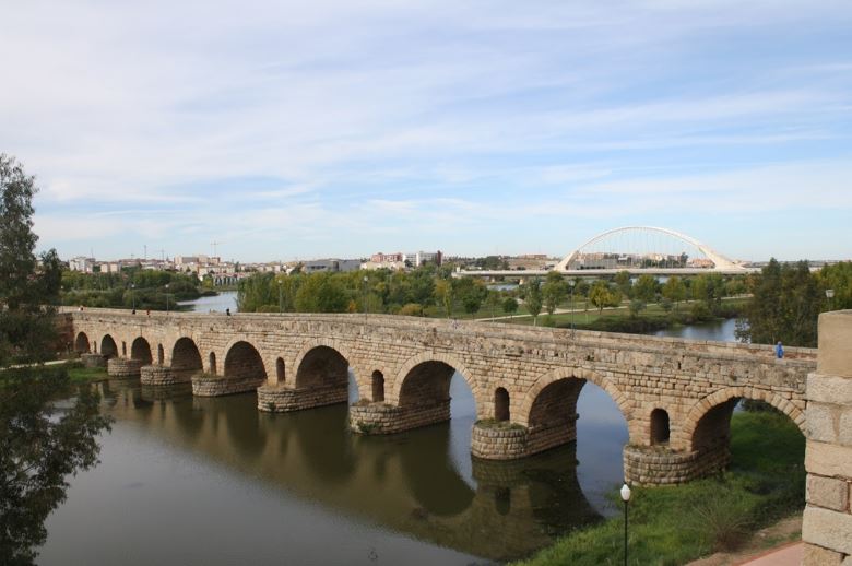 El nombre en época romana del río que vemos era el de Anas, al que se le añadió posteriormente el prefijo árabe Guad, que significa río. Pues bien, este río tiene un puente, o la puente, como decían los antiguos, uno de los más largos de la antigüedad. Es la obra que da sentido a la existencia de esta ciudad y, por su valor estratégico, un elemento crucial para el comercio y para todas las guerras que han tenido como escenario al occidente de la península.