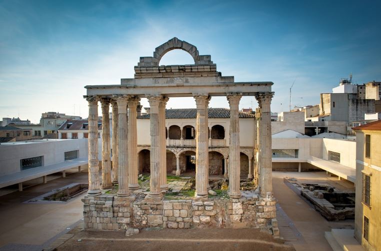Se trata de un Templo de Culto Imperial ubicado al fondo de una gran plaza que fue parcialmente nivelada, ya que se evidencian en algunas zonas restos de un criptopórtico. Debió de erigirse aún bajo el poder de Augusto. El templo, de planta rectangular, se alza sobre un alto podio de granito que concluye en molduras. Sobre él asienta la columnata cuyos tambores de granito estuvieron estucados y pintados. Esta columnata rodea todo el templo. En su frente, al sur, presenta seis columnas sobre las que asentaba el tímpano. Una escalinata, de la que sólo se conserva la subestructura, servía de acceso a la cella. En una exedra que segmentaba la escalinata puede que se ubicara el altar. Su estado de conservación excepcional se debe a que, durante siglos, el templo sirvió de cimiento y armazón del palacio renacentista del Conde de los Corbos. En dicho palacio se ha habilitado un centro de interpretación que desarrolla su contenido en torno a la importancia del edificio en época romana y sus usos posteriores.