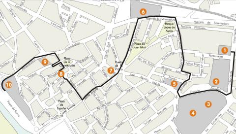 Este circuito incluye las siguientes paradas: Centro de Recepción de Turistas, Casa del Anfiteatro, Anfiteatro, Teatro, MNAR, Basílica de Santa Eulalia, Decumano máximo, Arco de Trajano, Templo calle Holguín, Área arqueológica de Morería.